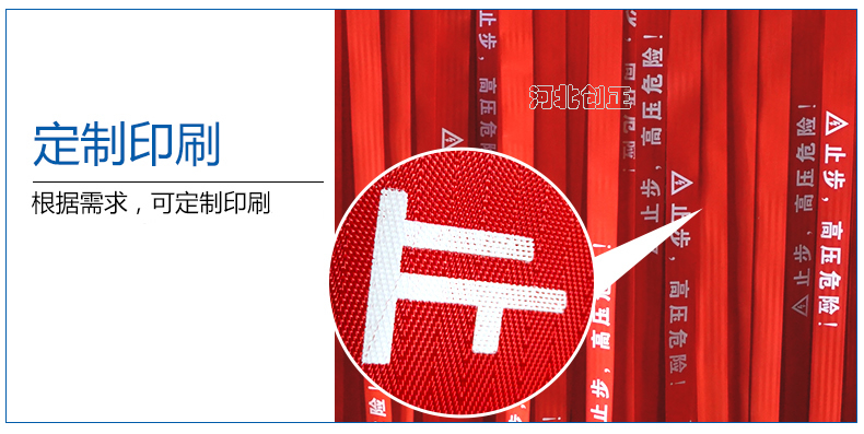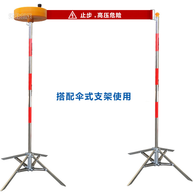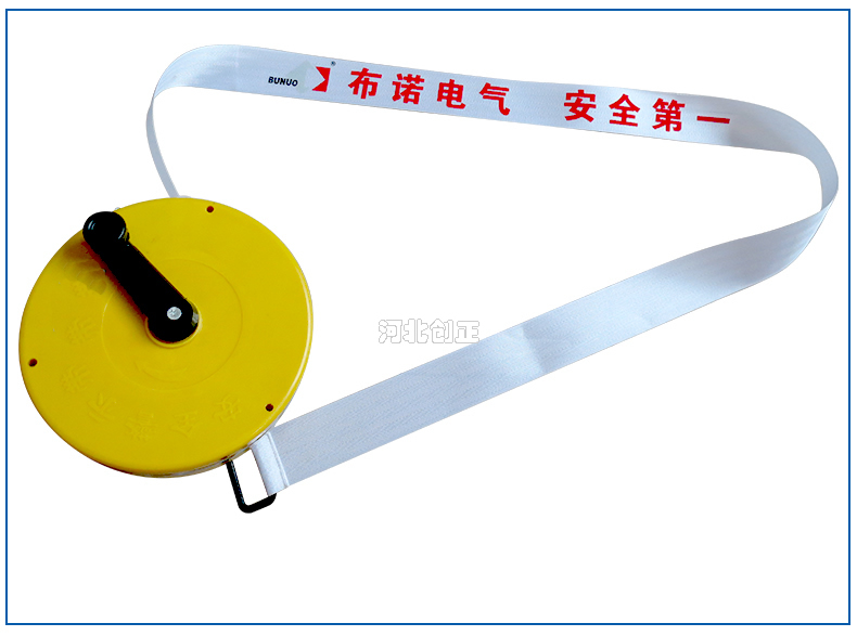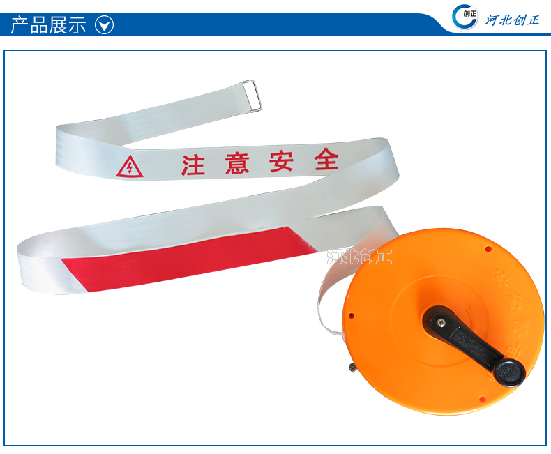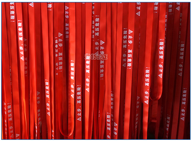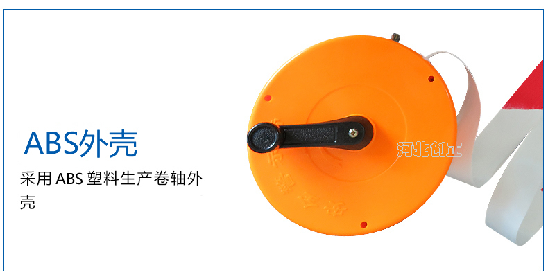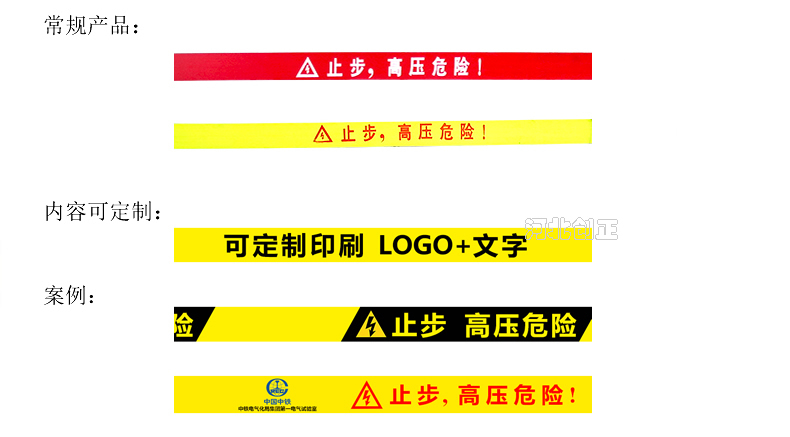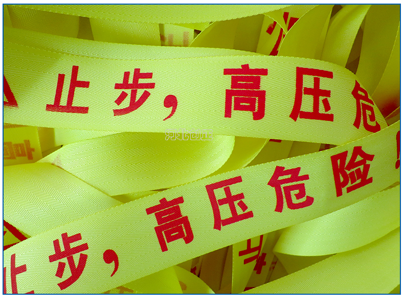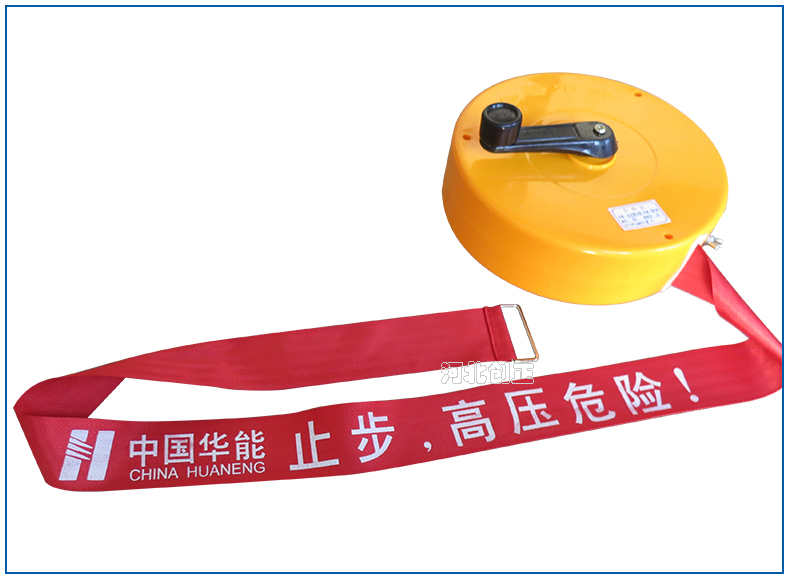 警示帶盒是ABS材料制成;帶是錦綸材質,上面印有閃電符號,止步,高壓危險等字樣。