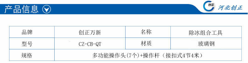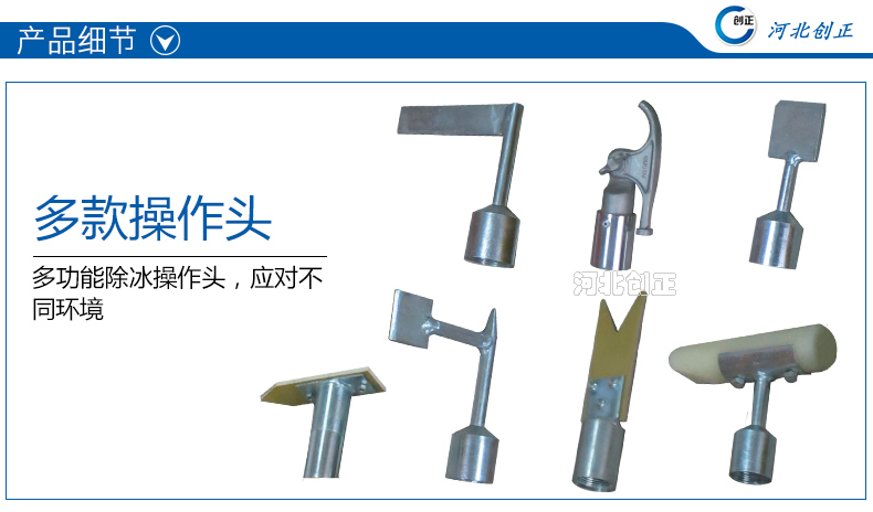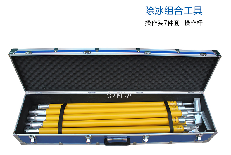 除冰組合工具由絕緣桿和不同的操作頭組成,通過敲、鏟、鉤等方式除去瓷瓶、支架、導線及桿塔上的積雪及覆冰。除冰作業時,選取操作頭,安裝到絕緣桿的一端并擰緊后使用。絕緣桿分為長、短規格,根據現場實際情況進行組合。