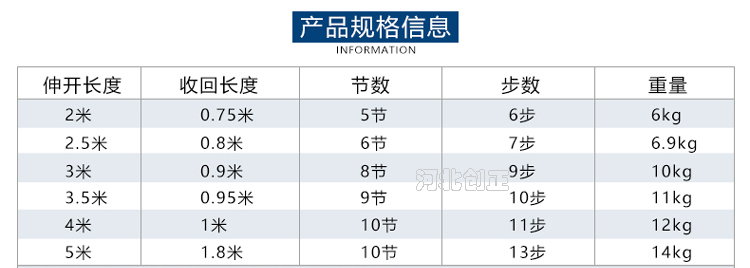 伸態5.0m, 縮態1.20m 10節, 13步;