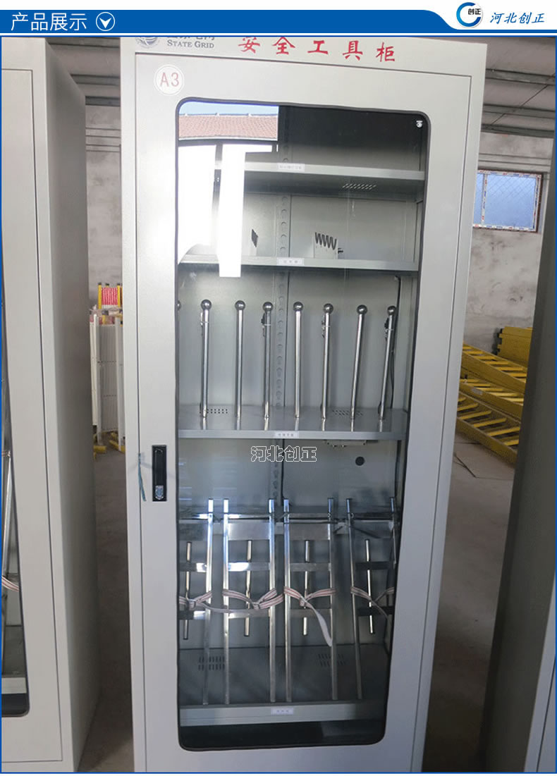 1、柜體是冷軋鋼板卷壓成型,厚度有1.0mm,1.2mm,1.5mm供選擇。柜體表面采用靜電防腐噴塑工藝,顏色為駝灰色,柜門裝有通體透明鋼化玻璃,透過玻璃可以看到分類有序的工器具。