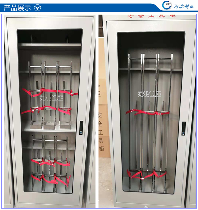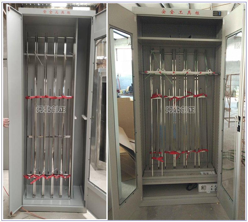 1、柜體是冷軋鋼板卷壓成型,厚度有1.0mm,1.2mm,1.5mm供選擇。柜體表面采用靜電防腐噴塑工藝,顏色為駝灰色,柜門裝有通體透明鋼化玻璃,透過玻璃可以看到分類有序的工器具。