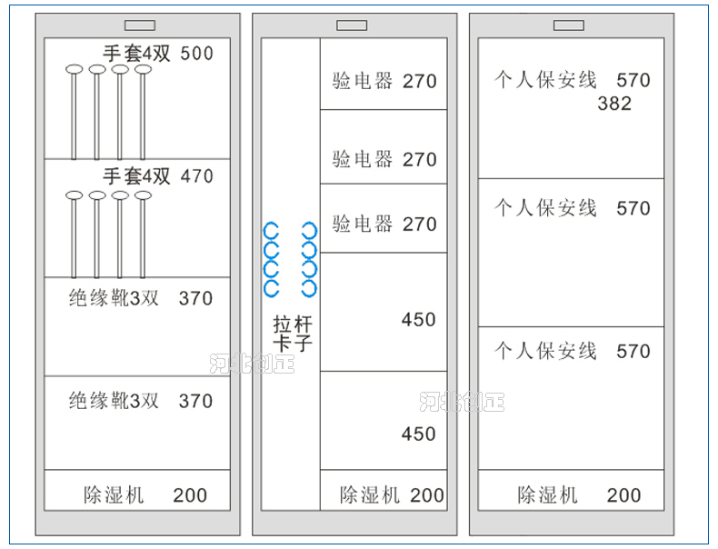 2、智能型安全工具柜裝有溫濕度顯示表和控制操作面板,顯示溫濕度和設備運行狀態。柜底可選擇安裝萬向輪和定位螺桿;柜頂可選擇安裝吊杯,方便運輸。應用于不同溫濕度地區的不同電壓等級的變電站、集控站、線路工區以及電力公司等單位。